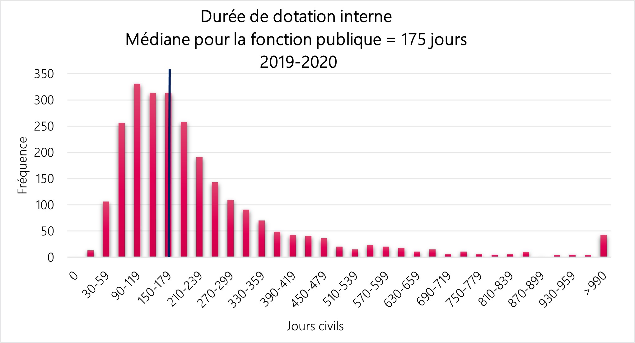 La durée médiane de dotation interne pour la fonction publique (organisations assujetties à la Loi sur l’emploi dans la fonction publique) pour l’exercice financier 2019 à 2020 est 175 jours.