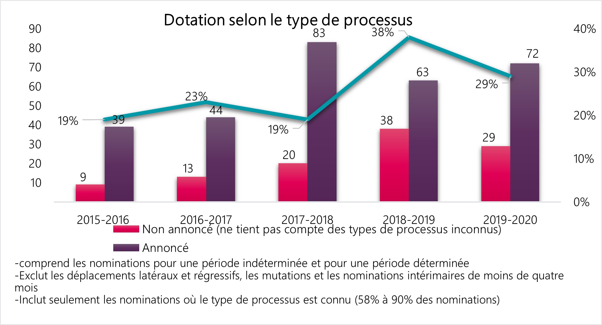 - Seules les nominations à des postes de durée déterminée et les nominations à des postes pour une période indéterminée sont incluses (les mutations, les nominations occasionnelles et les nominations intérimaires sont exclues)