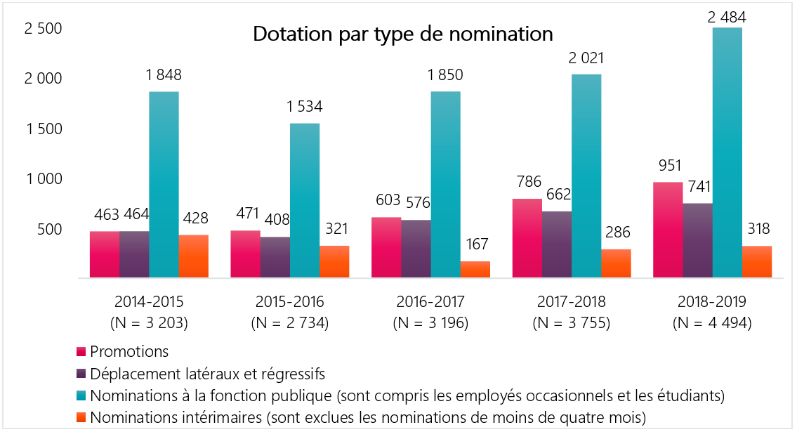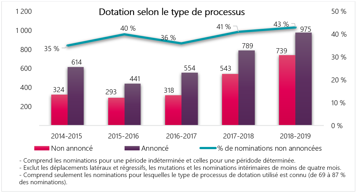 - Seules les nominations à des postes de durée déterminée et les nominations à des postes pour une période indéterminée sont incluses (les mutations, les nominations occasionnelles et les nominations intérimaires sont exclues)