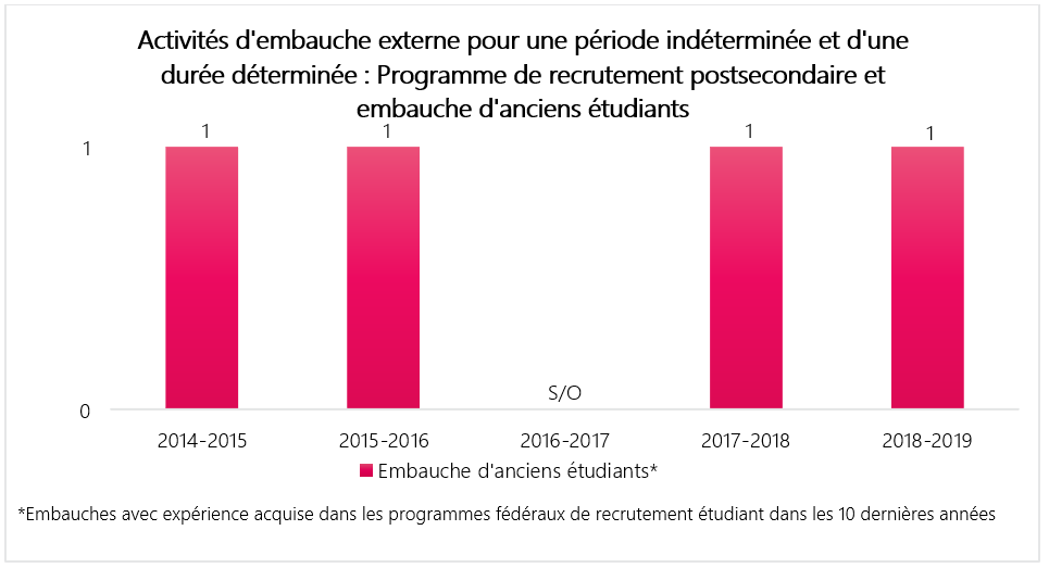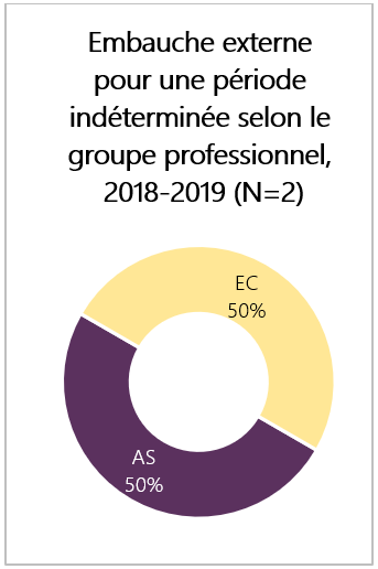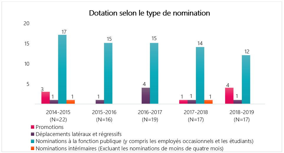 Au cours de l’exercice financier 2018-2019, l’organisation, par l’entremise de son fournisseur de services, Services publics et approvisionnement Canada, a exécuté 17mesures de dotation, détaillées comme suit :