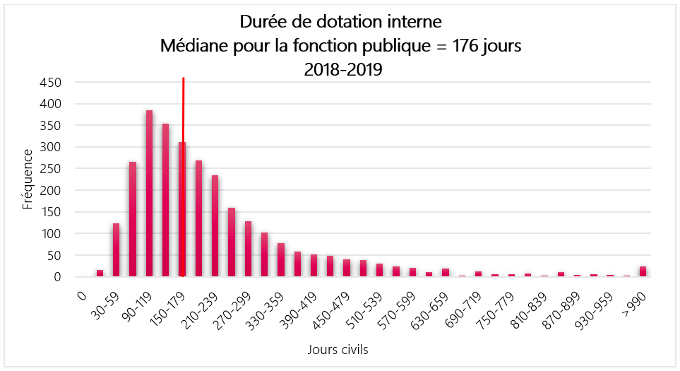 La durée médiane de dotation interne pour la fonction publique (organisations assujetties à la Loi sur l’emploi dans la fonction publique) pour l’exercice financier 2018 à 2019 est 176 jours. Les données sont insuffisantes pour fournir des résultats sur la durée des processus de dotation interne pour la Commission mixte internationale.