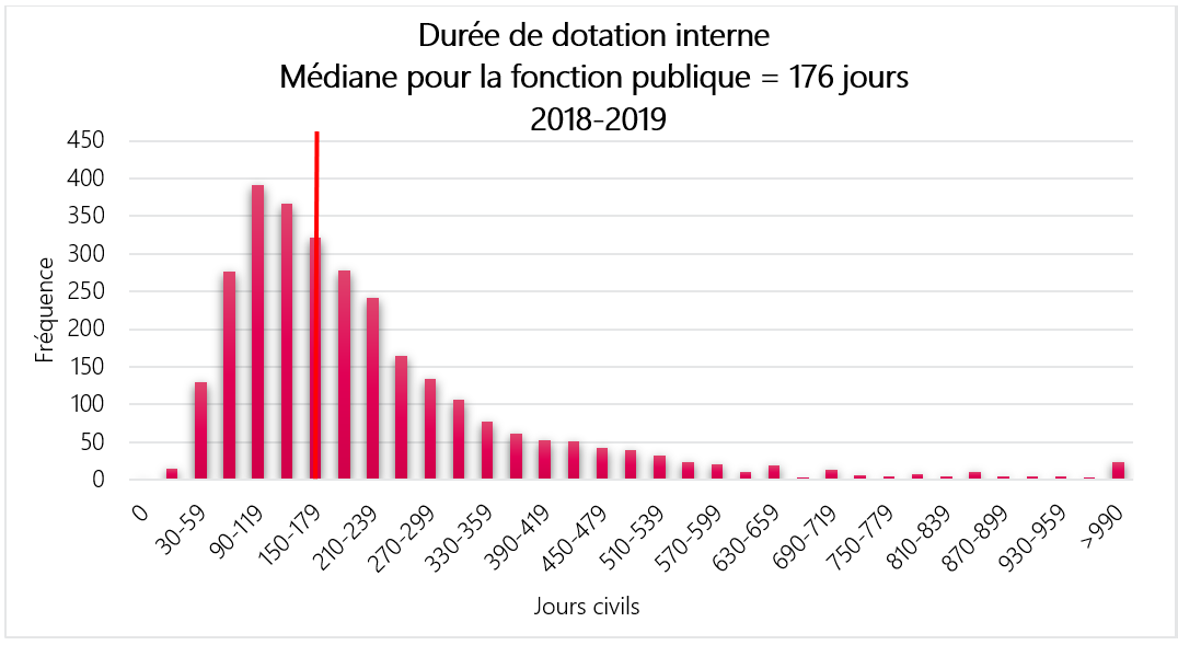 La durée médiane de dotation interne pour la fonction publique (organisations assujetties à la Loi sur l’emploi dans la fonction publique) pour l’exercice financier 2018 à 2019 est 176 jours.
