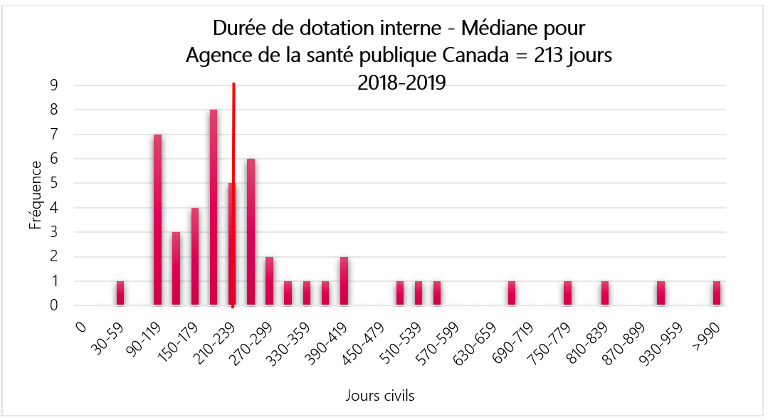 La durée médiane de dotation interne pour l’Agence de santé publique du Canada pour l’exercice financier 2018 à 2019 est 213 jours.