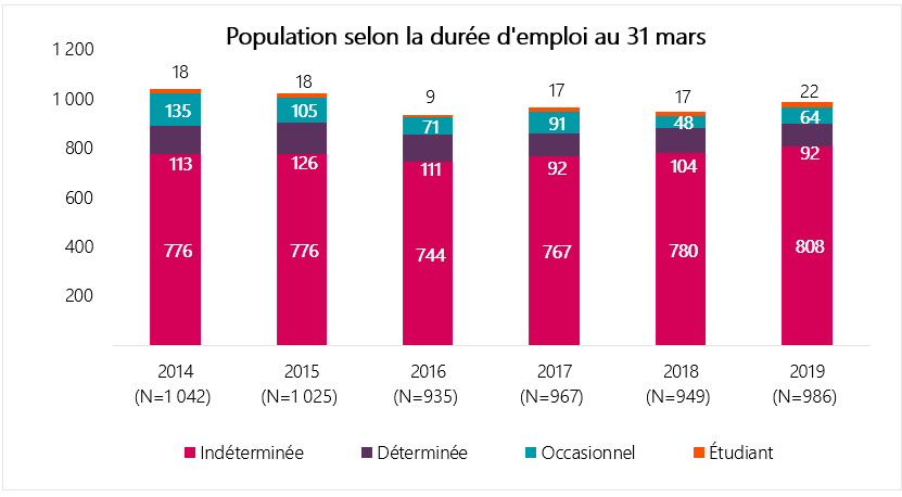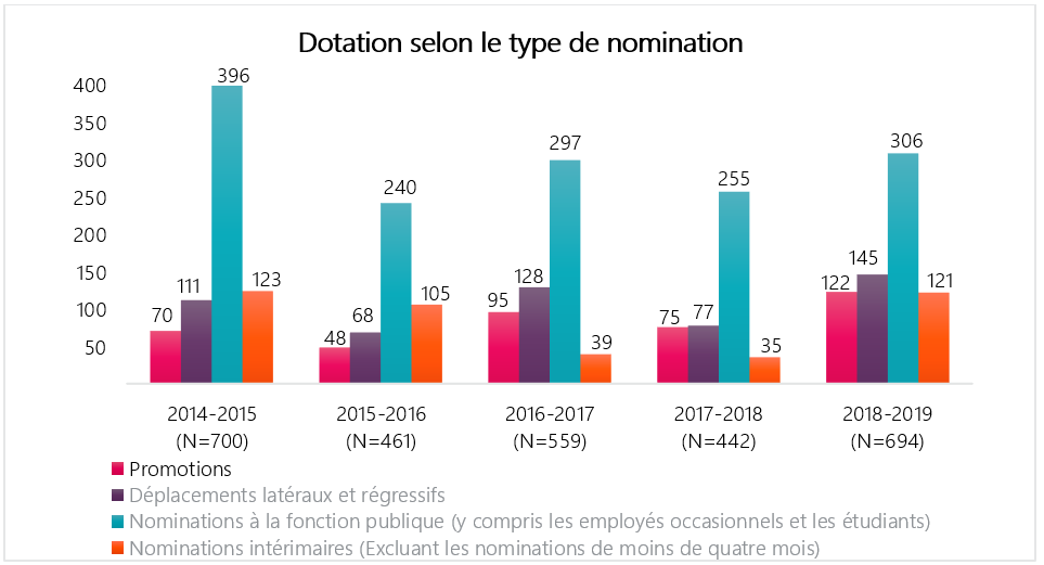 - Seules les nominations d'une durée déterminée et les nominations pour une période indéterminée sont incluses (les mutations, les nominations d’employés occasionnels et les nominations intérimaires sont exclues).