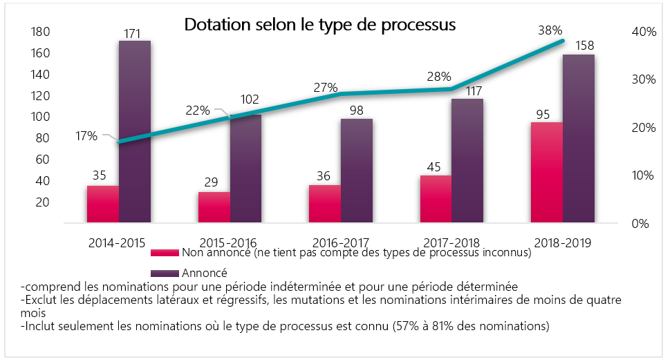 - Seules les nominations à des postes de durée déterminée et les nominations à des postes pour une période indéterminée sont incluses (les mutations, les nominations occasionnelles et les nominations intérimaires sont exclues)