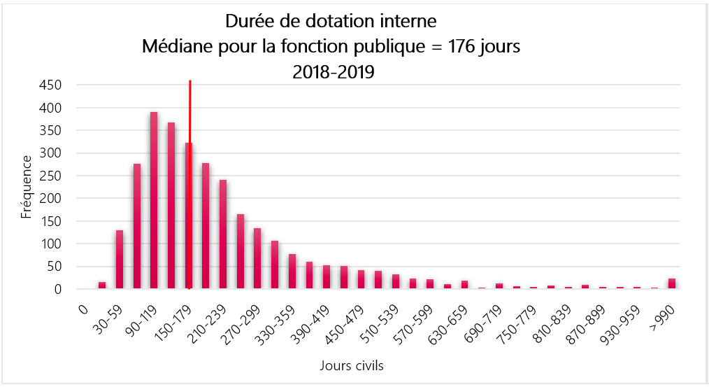 La durée médiane de dotation interne pour la fonction publique (organisations assujetties à la Loi sur l’emploi dans la fonction publique) pour l’exercice financier 2018 à 2019 est 176 jours