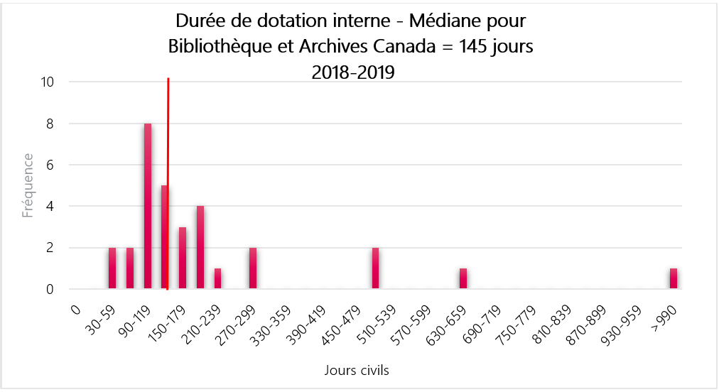 La durée médiane de dotation interne à Bibliothèque et Archives Canada pour l’exercice financier 2018 à 2019 est 145 jours