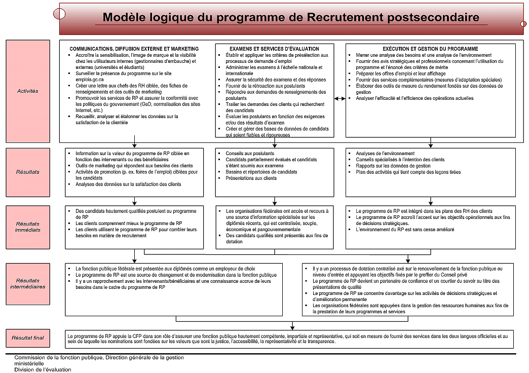 L'évaluation visait à établir si le programme de RP atteint les objectifs fixés et les résultats prévus, s'il est efficace et s'il permet d'optimiser les ressources. Elle permet également de déterminer, de façon plus générale, dans quelle mesure le gouvernement fédéral parvient à recruter des gens de talent dans la période cruciale de renouvellement et de transition que nous traversons actuellement. L'annexe A donne une représentation graphique de la logique du programme du RP.