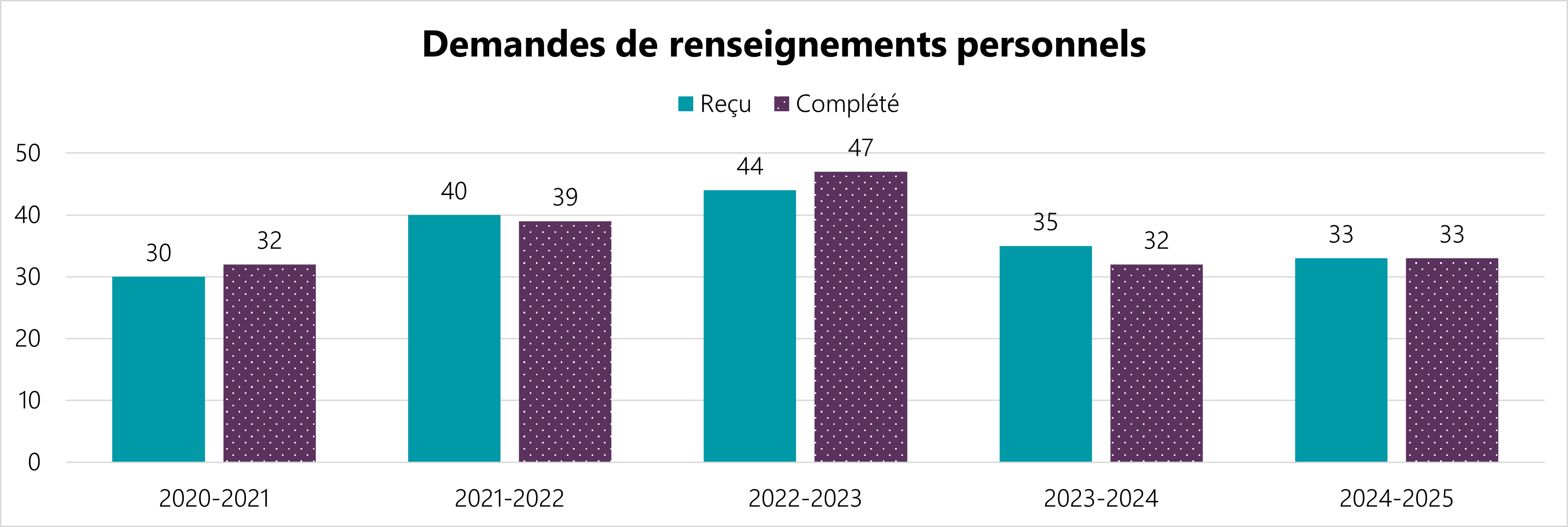 Au cours de la période de rapport 2024-2025, la CFP a reçu au total 60 demandes présentées en vertu de la Loi sur l’accès à l’information et de la Loi sur la protection des renseignements personnels. Ceci représente une diminution de 20 % du nombre total de demandes reçues par rapport à l’exercice précédent. De façon générale, le volume est demeuré relativement stable au cours des 5 dernières périodes de rapport.