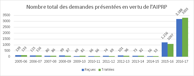 Au cours des deux dernières périodes de rapport, la CFP a temporairement connu une forte hausse de la charge de travail. À partir de mai 2015, un demandeur unique a commencé à présenter régulièrement plusieurs demandes en vertu des deux lois, pour un total de 1 048 demandes durant l’exercice 2015-2016 et de 3 009 demandes durant l’exercice 2016-2017.