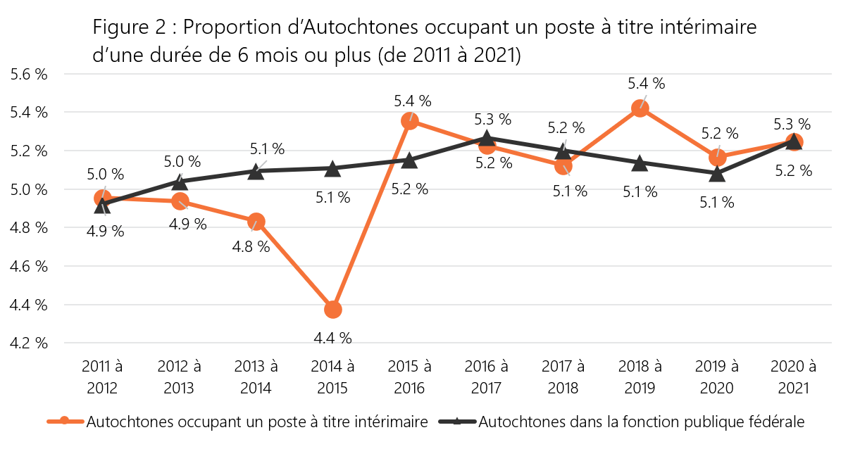 | Autochtones occupant un poste à titre intérimaire | 5,0 % | 4,9 % | 4,8 % | 4,4 % | 5,4 % | 5,2 % | 5,1 % | 5,4 % | 5,2 % | 5,2 % |