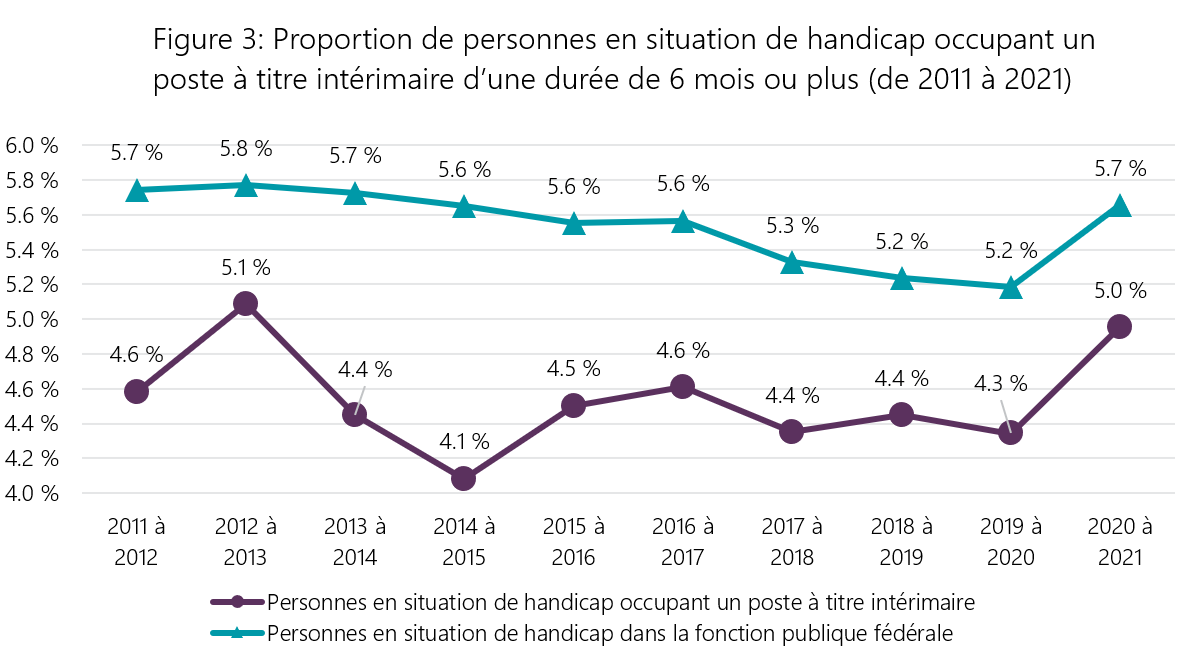 | Personnes en situation de handicap occupant un poste à titre intérimaire | 4,6 % | 5,1 % | 4,4 % | 4,1 % | 4,5 % | 4,6 % | 4,4 % | 4,4 % | 4,3 % | 5,0 % |