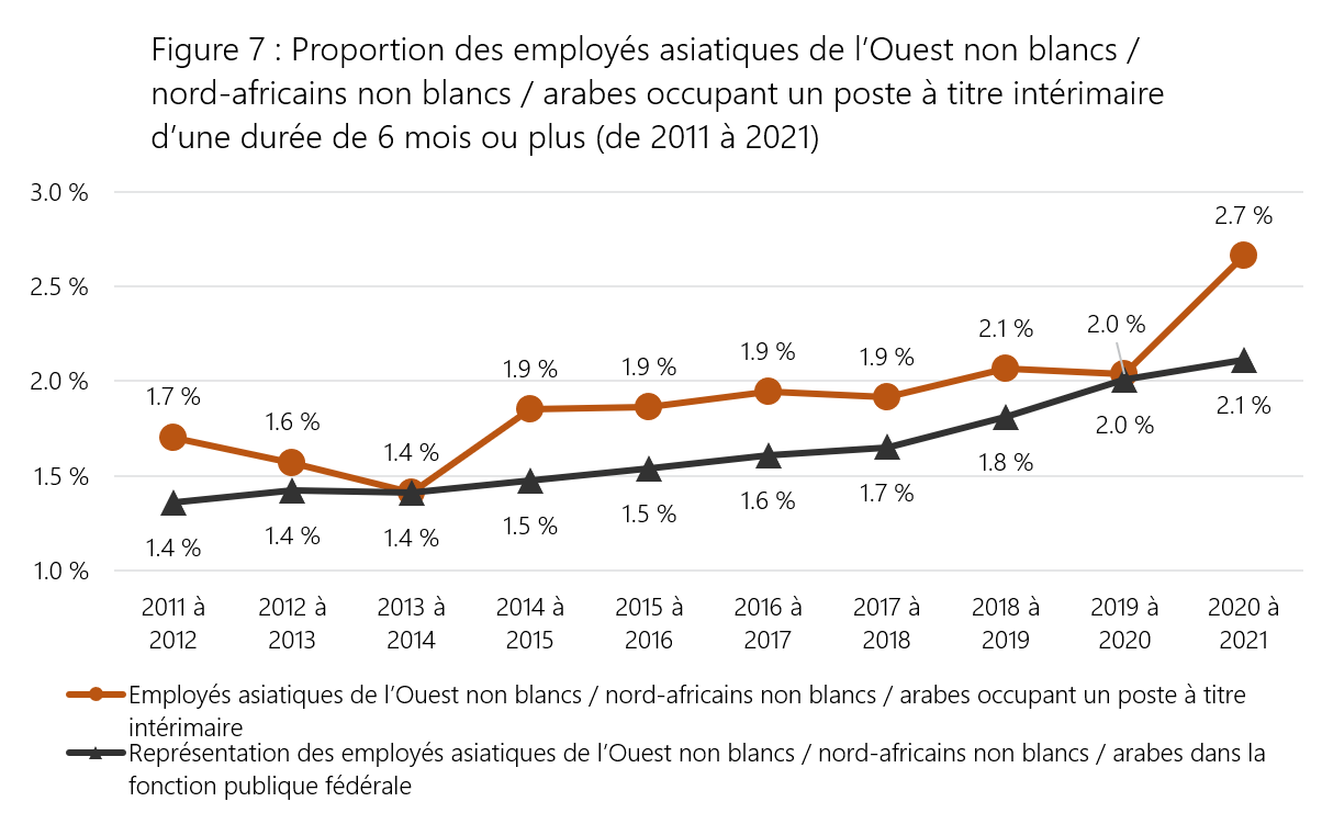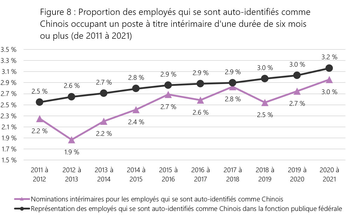 - En ce qui concerne les 4 plus grands sous-groupes de membres des minorités visibles, la représentation des employés noirs, asiatiques du Sud / indiens de l’Est et asiatiques de l’Ouest / nord-africains non blancs et arabes dans les nominations intérimaires, entre 2011 et 2021, a été en grande partie égale ou supérieure à leur représentation dans l’ensemble de la fonction publique. En revanche, les employés qui se sont auto-identifiés comme Chinois ont été sous-représentés au cours de 9 des 10 années examinées.