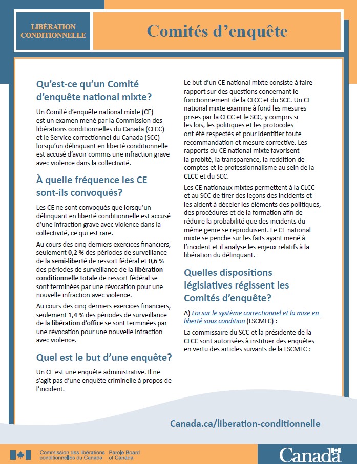 Un Comité d'enquête national mixte (CE) est un examen mené par la Commission des libérations conditionnelles du Canada (CLCC) et le Service correctionnel du Canada (SCC) lorsqu'un délinquant en liberté conditionnelle est accusé d'avoir commis une infraction grave avec violence dans la collectivité.