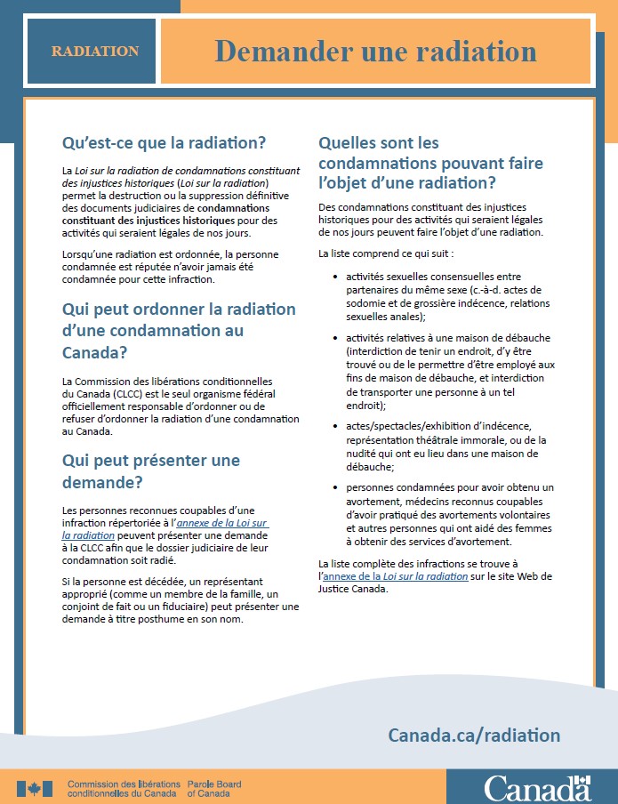 La Loi sur la radiation de condamnations constituant des injustices historiques (Loi sur la radiation) permet la destruction ou la suppression définitive des documents judiciaires de condamnations constituant des injustices historiques pour des activités qui seraient légales de nos jours.