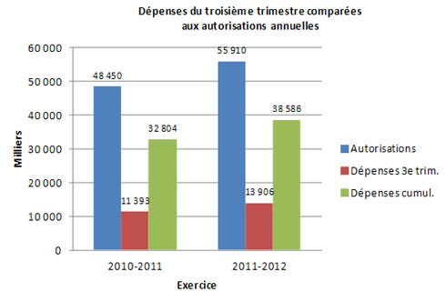 Source: CLCC. Le graphique est sous la forme d'un graphique à barres montrant les autorisations et les dépenses annuelles cumulatives et celles pour le troisième trimestre pour 2010-2011 et 2011-2012.