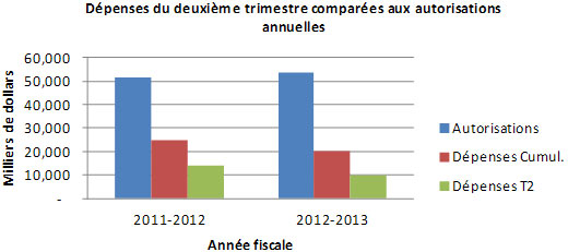 Source: CLCC. Le graphique est sous la forme d'un graphique à barres montrant les autorisations et les dépenses annuelles cumulatives et celles pour le deuxième trimestre pour 2011-2012 et 2012-2013.