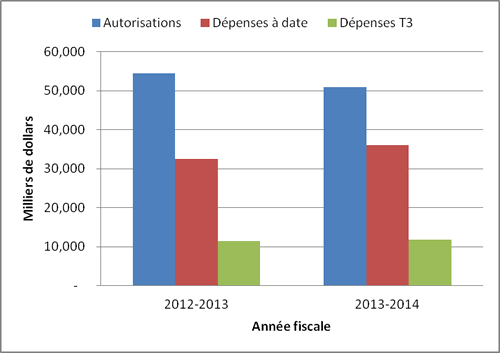 Source: CLCC. Le graphique est sous la forme d'un graphique à barres montrant les autorisations et les dépenses pour le troisème trimestre pour 2012-2013 et 2013-2014.
