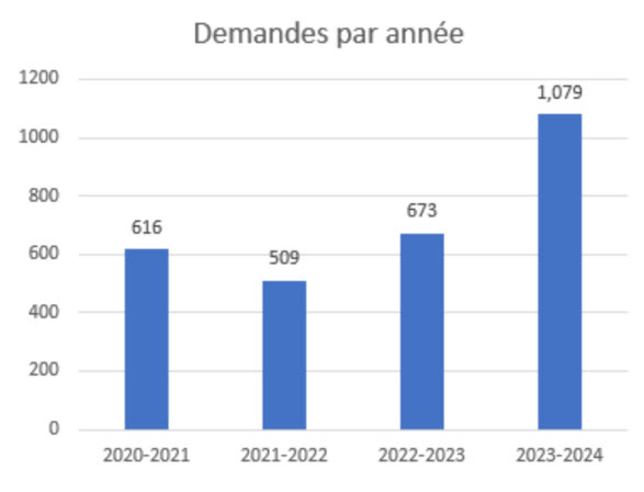 | Demandes reçues | 616 | 509 | 673 | 1 079 |