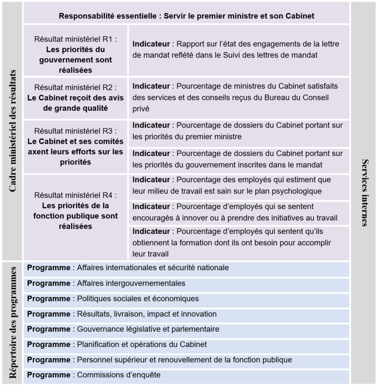 Le Cadre ministériel des résultats et le Répertoire des programmes approuvés du Bureau du Conseil privé pour 2021-2022 sont illustrés ci-dessous :