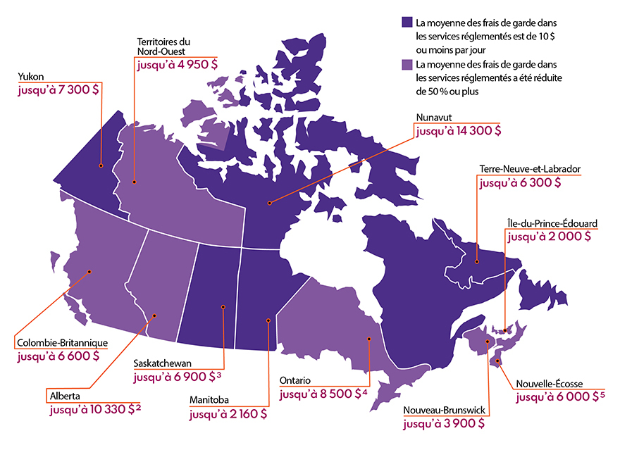 - le Québec avait réduit frais moyens à moins de 10 $ par jour avant la création du système d'apprentissage et de garde des jeunes enfants à l'échelle du Canada;