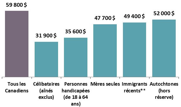 - Les revenus réels de certains groupes sont nettement inférieurs à la moyenne nationale, notamment les célibataires (à l'exclusion des personnes âgées), les personnes handicapées, les femmes chefs de famille monoparentale, les immigrants récents et les Autochtones (en dehors des réserves).