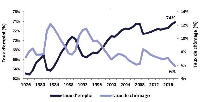 - La proportion des Canadiens âgés de 15 à 64 ans qui ont un emploi est passée de 63 % en 1976 à 74 % en 2018.