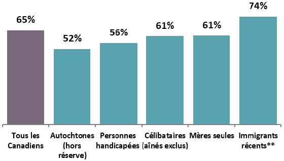 - Certains groupes ont plus de difficultés que d'autres à trouver un emploi. Les groupes qui ont des taux inférieurs à la moyenne de tous les Canadiens comprennent les personnes handicapées, les Autochtones (en dehors des réserves), les femmes chefs de famille monoparentale (de 15 à 54 ans), les immigrants récents et les celibataires (à l'exclusion des personnes âgées).