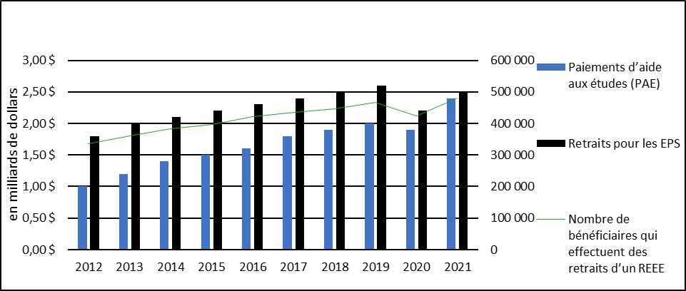 - Figure 10 : PAE et retraits pour les EPS en dollars constants de 2021 et nombre de bénéficiaires qui effectuent des retraits d’un REEE