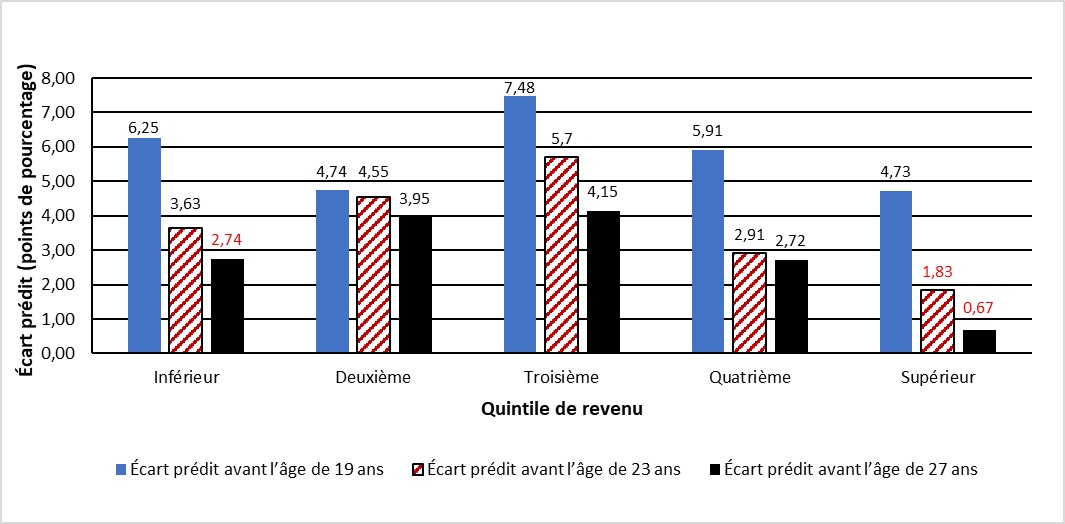 - Figure 7 : Écart prédit des taux d’inscription aux EPS entre ceux qui détiennent un REEE et ceux qui n’en détiennent pas, selon le quintile de revenu et l’âge