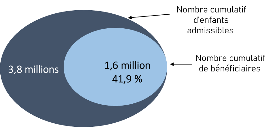 - À la fin de 2020, le nombre total d'enfants ayant déjà reçu le BEC par le passé représentait 41,9 % de la population admissible. Ce chiffre est révélateur d'un besoin pour une meilleure sensibilisation et un accès plus facile au bon.