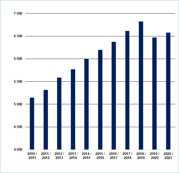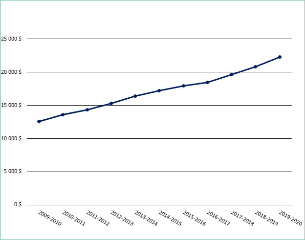 Gouvernement du Canada, Statistique Canada. Tableau : 37-10-0003-01 (anciennement CANSIM 477-0021), Droits de scolarité des étudiants canadiens selon les domaines d'études (Annuel). https://www150.statcan.gc.ca/t1/tbl1/fr/tv.action?pid=3710000301&pickMembers%5B0%5D=1.1&cubeTimeFrame.startYear=2010+%2F+2011&cubeTimeFrame.endYear=2020+%2F+2021&referencePeriods=20100101%2C20200101&request_locale=fr