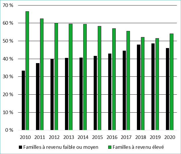 - L'écart au niveau de l'épargne-études entre les familles à revenu faible ou moyen (comme celles qui sont admissibles à la Subvention canadienne pour l'épargne-études supplémentaire et/ou au BEC) et les familles à revenu élevé s'est grandement atténué au fil du temps. L'écart au niveau de l'épargne-études qui était de plus de 33 % en 2010 s'est réduit à environ 3 % en 2019. Cette tendance s'est toutefois inversée en 2020 quand l'écart a augmenté pour atteindre environ 8 % au cours de la pandémie de COVID-19.