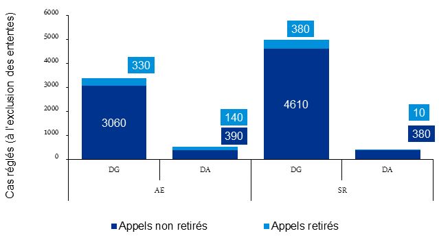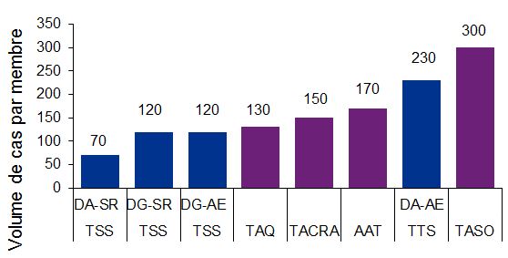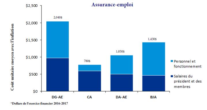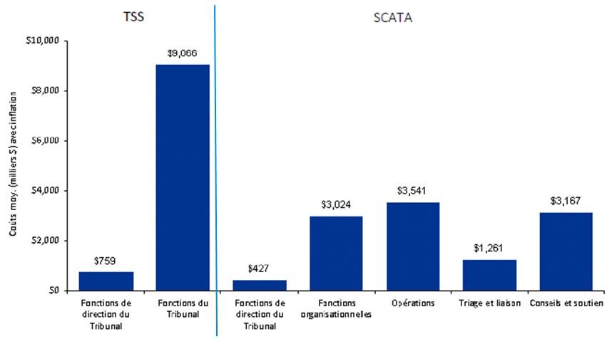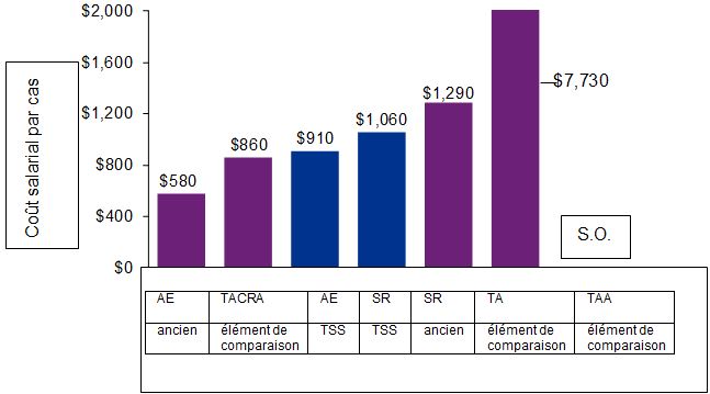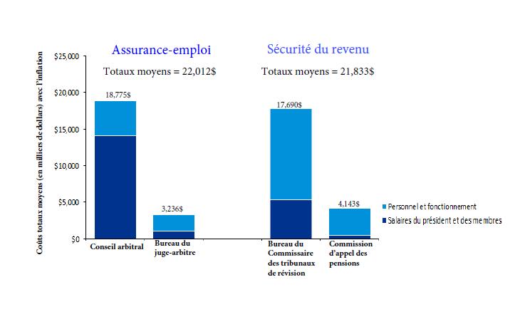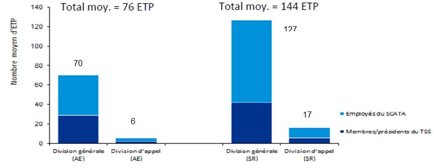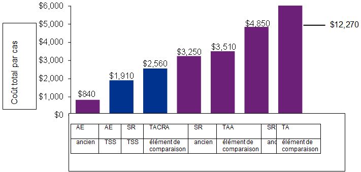 - Sans égard aux défis auxquels le TSS a été confronté durant la transition, le coût total du TSS est moins élevé que le coût total des quatre anciens tribunaux réunis. Cependant, le coût moyen par appel relatif à l’assurance-emploi auprès de la Division générale du TSS est considérablement plus élevé qu’auprès de l’ancien Conseil arbitral. Le coût moyen pour tout autre appel auprès du TSS est inférieur est moins élevé que ce qu’il en coûtait auprès des trois autres anciens tribunaux.