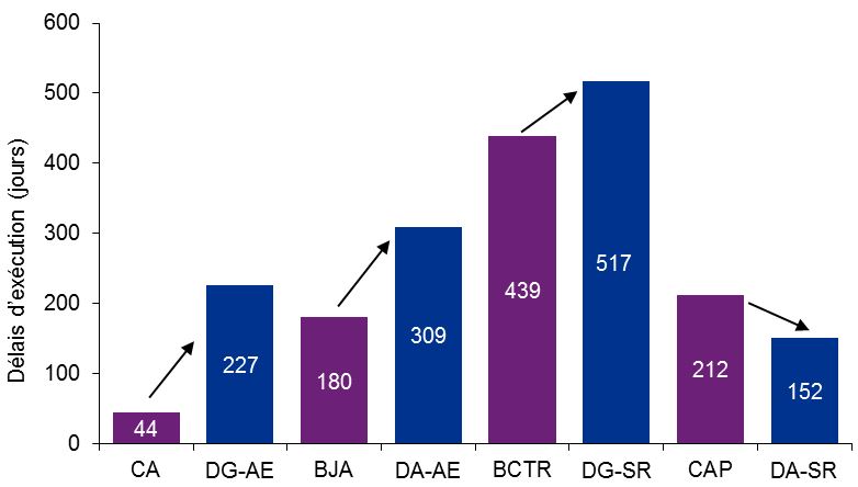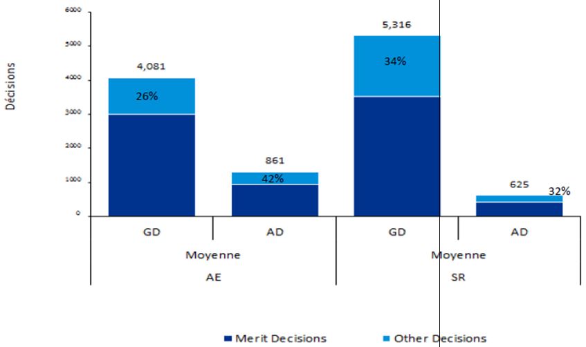 - Par rapport aux anciens tribunaux, les délais depuis l’étape de la présentation de la demande à la décision sont plus longs pour les décisions de la Division générale (sections Assurance-emploi et Sécurité du revenu), ainsi que pour les appels soumis à la Division d’appel – Assurance-emploi. Ces délais sont particulièrement importants dans le cas de la Division générale – Assurance-emploi, soit cinq fois plus longs en moyenne par rapport à l’ancien Conseil arbitral.