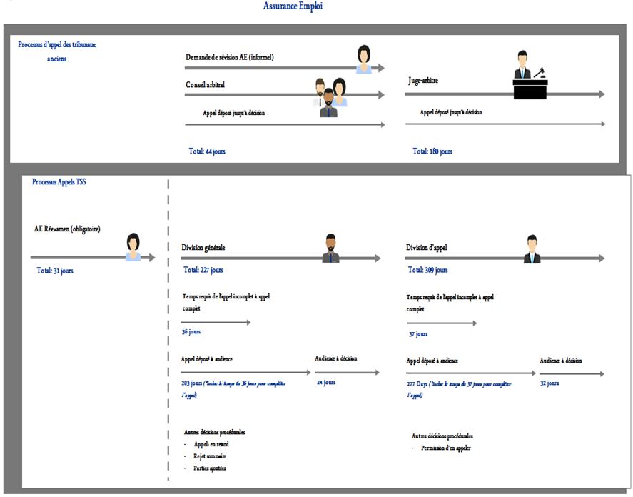- L’examen de la structure d’appel et de son cadre législatif et réglementaire habilitant a permis de constater qu’un certain nombre de mesures introduites afin d’accélérer les appels ayant une chance raisonnable de succès ont eu l’effet non souhaité de ralentir le processus et d’engendrer des frustrations chez les clients. Qui plus est, les processus du TSS témoignent majoritairement d’une approche « applicable à tous », sans faire la distinction entre la nature de courte durée du régime de prestations d’assurance-emploi et la nature de longue durée des programmes de pensions.