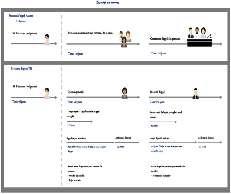 - Les processus d’appel du TSS émanent de sa loi habilitante adoptée en 2012 et du règlement connexe publié en 2013. Il est important de reconnaître qu’un certain nombre de changements nécessaires au passage de l’ancien Conseil arbitral vers le système actuel reflètent les pratiques exemplaires actuelles et accroissent l’indépendance du système d’appel, une exigence fondamentale pour un tribunal administratif. Il demeure toutefois que l’approche du TSS, qui consiste à appliquer strictement la loi, comporte ses revers en ce qui a trait à l’efficacité, à l’efficience et à l’orientation du client. Fournir un service axé sur le client tout en tirant parti de la souplesse maximale de la loi habilitante du TSS et de son règlement d’application est ce qui permettra de servir les Canadiens vulnérables de la meilleure façon possible.