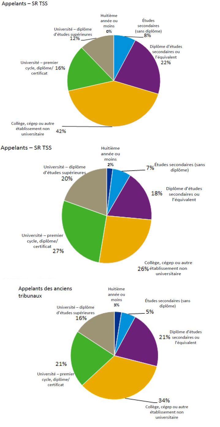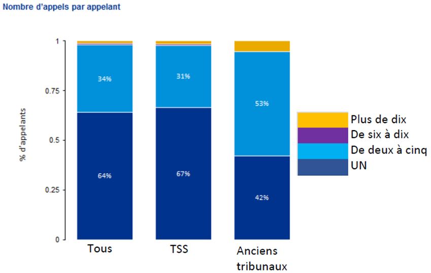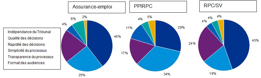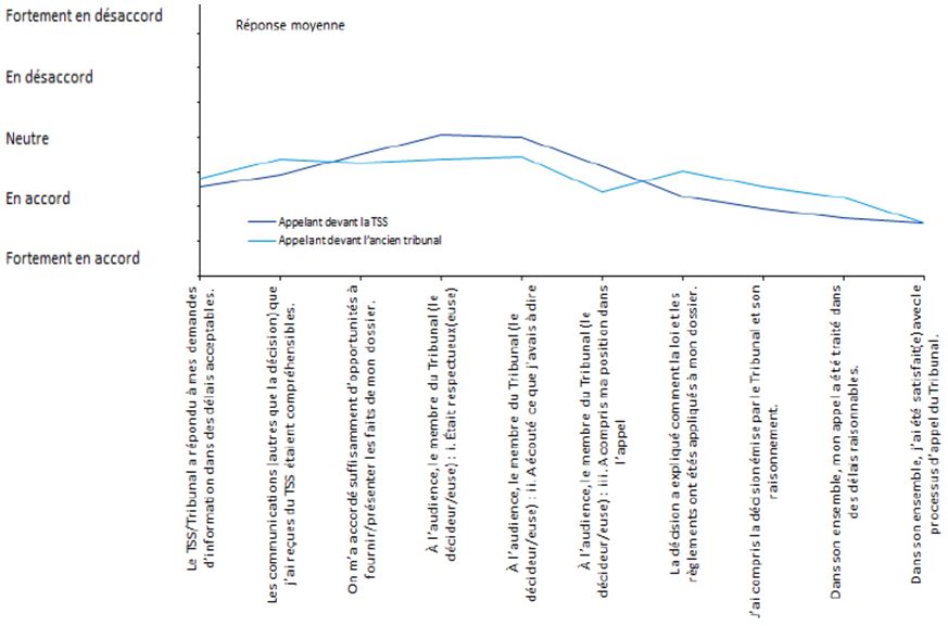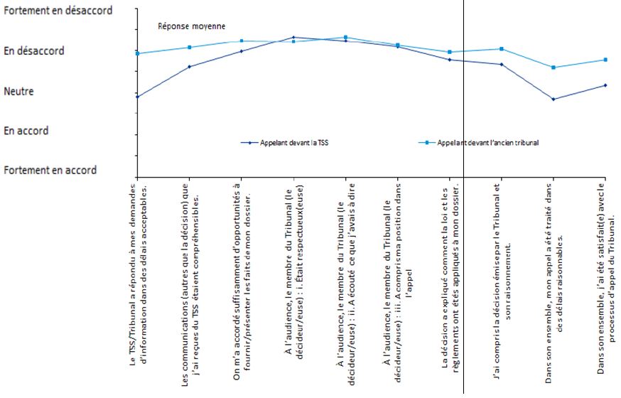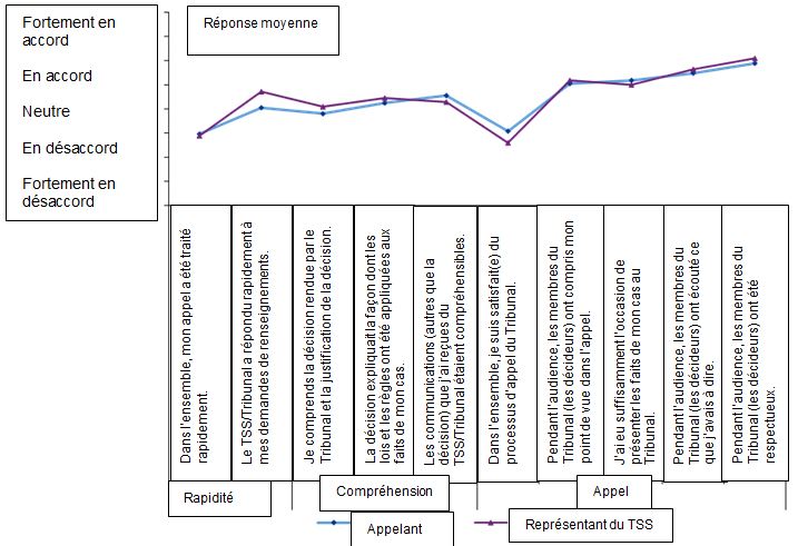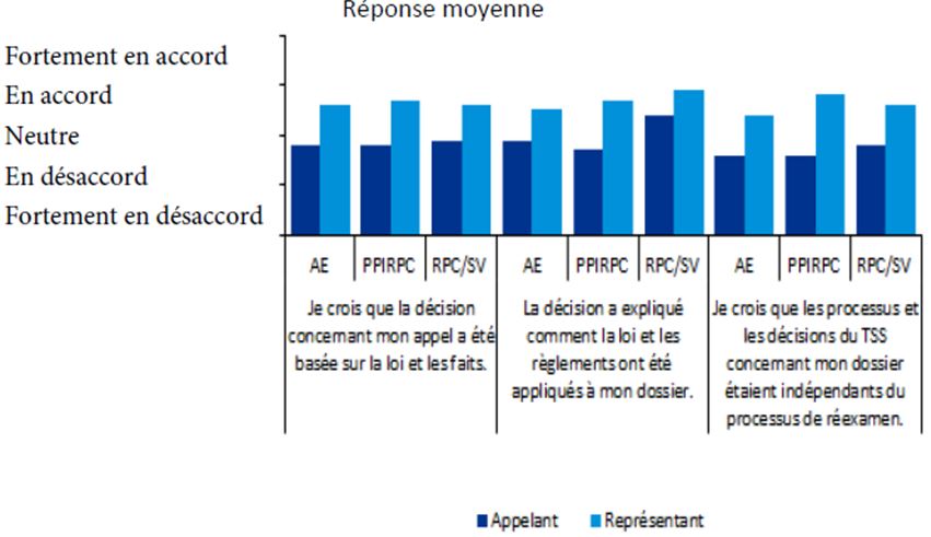 Bien que le cadre législatif et réglementaire sous-tendant les processus et les opérations du TSS comporte des différences importantes par rapport aux anciens tribunaux, sa raison d’être demeure la même : rendre des décisions justes, de la façon la plus rapide et la plus économique possible en ce qui concerne les appels et les autres demandes, et veiller à ce que la démarche se déroule aussi simplement et prestement que les circonstances, l’équité et la justice naturelle le permettent. Il y a deux paliers d’appel pour chaque programme, comme c’était le cas auparavant. Le fondement de l’appel – l’admissibilité en fonction des critères établis – demeure le même. Et le principe directeur consistant à fournir un processus d’appel équitable, crédible et accessible demeure inébranlable. Des économies d’échelle ont été réalisées en regroupant sous un seul tribunal les fonctions administratives de quatre tribunaux. D’après les réponses au sondage et les documents de référence, sans être élevée, la satisfaction des clients envers le TSS n’est pas forcément inférieure à ce qu’elle était à l’égard du système précédent. Toutefois, des plaintes tout à fait légitimes faisant état d’une complexité accrue, de délais prolongés et d’une entité formelle, distante et légaliste où l’on peine à s’orienter s’accompagnent de nombreux commentaires de gens qui regrettent les façons de faire du passé et réclament un changement.