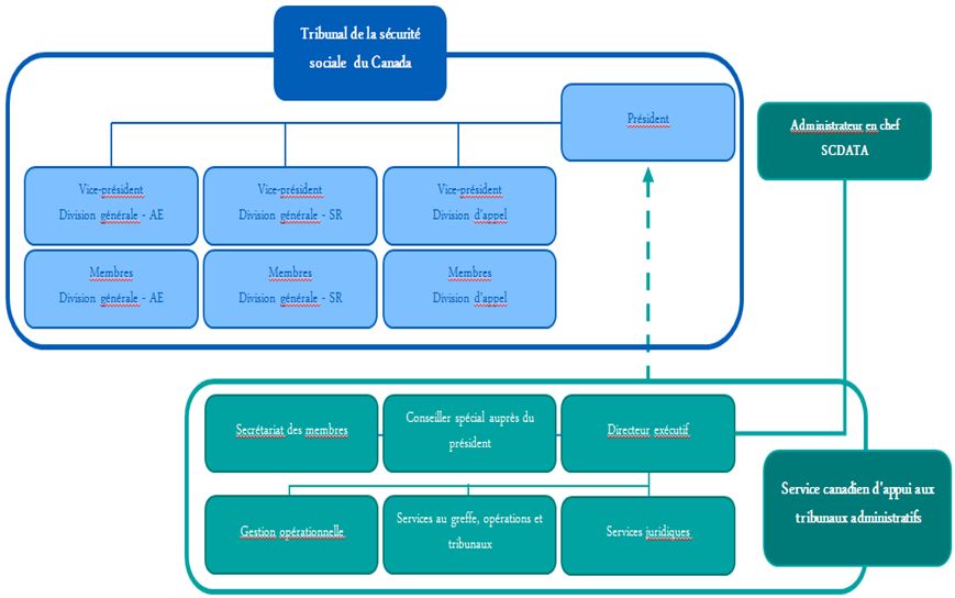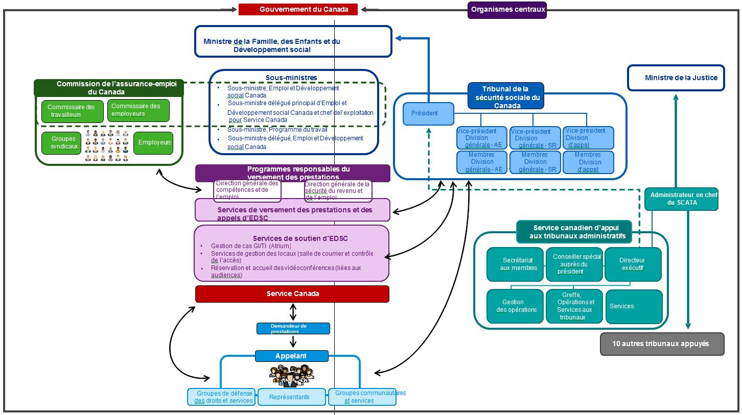 Sous la responsabilité du ministre d’Emploi et Développement social Canada, le TSS a été créé le 1er avril 2013 dans le but d’examiner les appels interjetés à l’égard de décisions rendues par la Commission de l’assurance-emploi du Canada (CAEC ou « la Commission ») relativement aux demandes d’assurance-emploi, et à l’égard de décisions d’EDSC concernant les programmes du Régime de pensions du Canada (RPC) et de la Sécurité de la vieillesse (SV). Ce nouveau tribunal administratif combinait sous une même structure quatre tribunaux administratifsNote de bas de page 1 rendant des décisions quasi judiciaires sur des litiges portés en appel pour les programmes susmentionnés. Ces anciens tribunaux exerçaient leurs activités sous la tutelle de l’ancien ministère des Ressources humaines et du Développement social du Canada (RHDSC) et de la CAEC.