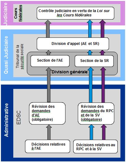 Avant d’interjeter appel devant le TSS, une personne doit d’abord demander à Service Canada de réviser sa demande refusée de prestations d’assurance-emploi, du Régime de prestations du Canada ou de la Sécurité de la vieillesse. Ce processus s’inscrit dans un processus de recours global, et n’est souvent pas distingué du processus d’appel par l’appelant; ainsi, les observations et les renseignements pertinents ayant trait au processus d’appel du TSS sont joints à la présente.