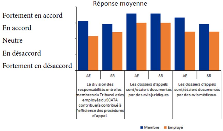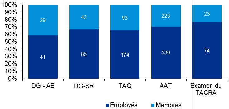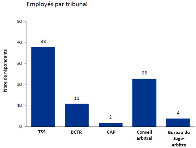 Il y avait 62 participants au sondage des employés, dont 38 (ou 61 %) étaient des employés du TSS/SCATA et les autres étaient des employés d’un ancien tribunal. En ce qui concerne les tribunaux précédents, plus de la moitié des répondants étaient des employés du conseil arbitral. Par ailleurs, 46 des participants ont indiqué avoir travaillé pour un seul des tribunaux, alors que les 16 autres participants avaient travaillé pour au moins deux tribunaux (soit le TSS/SCATA et un ancien tribunal ou plus d’un ancien tribunal).