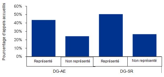 Les graphiques suivants présentent de l’information concernant l’aide aux appelants dans le cadre du processus d’appel. Des appels de l’AE devant le TSS, 78 % des appelants n’étaient pas représentés, par rapport à 57 % des appelants de la SR. Les données n’étaient disponibles que globalement pour les anciens tribunaux lorsque la représentation était semblable à celle des appelants de la SR devant le TSS.