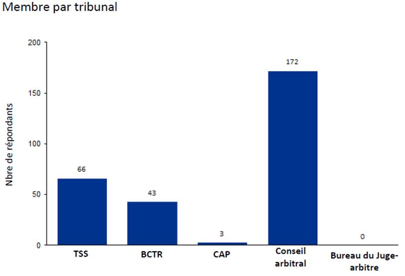Au total, 245 membres ont répondu au sondage. Le graphique ci-dessous montre que 172 (ou 70 %) des répondants ont indiqué avoir été nommés au conseil arbitral, 66 (ou 27 %) sont/étaient membres du TSS, 43 (ou 18 %) étaient membres du BCTR, et trois (ou 1 %) étaient membres de la CAP. Les membres du Bureau du Juge-arbitre n’ont pas été sollicités, car leurs coordonnées n’étaient pas disponibles. Il est à noter que 207 répondants ont indiqué être/avoir été membres d’un tribunal, 37 ont indiqué deux tribunaux et un répondant a indiqué trois tribunaux.