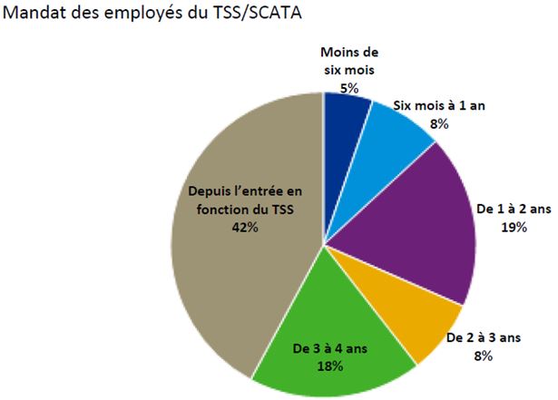 Tous les employés du TSS/SCATA qui ont participé au sondage ont indiqué toujours travailler pour le TSS/SCATA, à l’exception d’un. De plus, 42 % des employés ont indiqué travailler au TSS depuis son entrée en fonction, ce qui révèle une stabilité quant au mandat des membres (comme l’illustre le graphique ci-dessous).