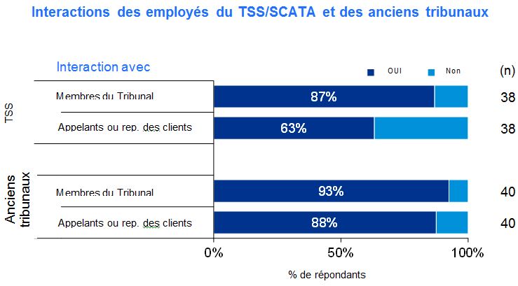 Bien que plus de 60 % des employés du TSS/SCATA ont indiqué interagir/avoir interagi avec des membres du Tribunal et directement avec les appelants et/ou les représentants des clients, leurs interactions étaient moins fréquentes que celles des employés des anciens tribunaux, ce qui concorde avec les entrevues qui ont fait ressortir des fonctions à portée plus restreinte pour les employés du TSS/SCATA.