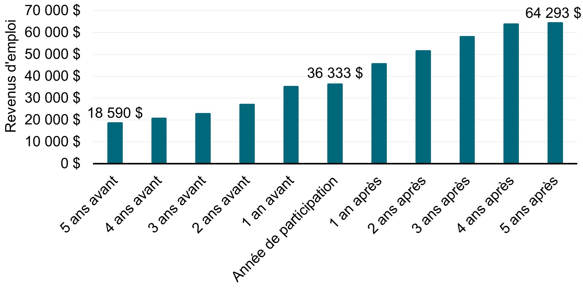 Comme le montre le graphique 6, les participants au programme ont vu leurs revenus moyens augmenter de 18 590 $ au cours de la cinquième année précédant le programme à 64 293 $ au cours de la cinquième année qui a suivi la première année de participation au programme.