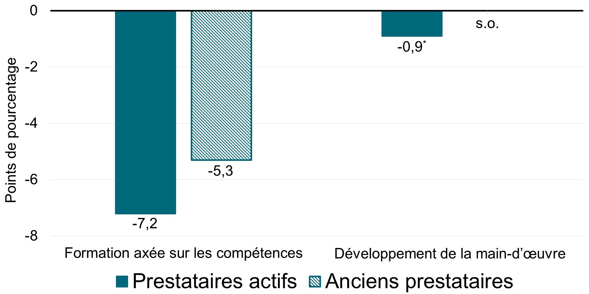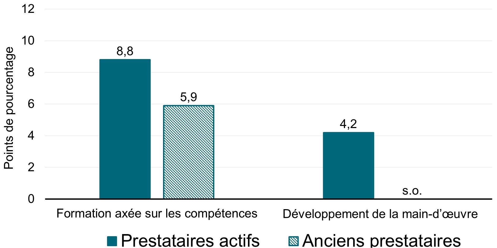 Le graphique i présente les impacts différentiels sur l’incidence d’emploi chez les anciens prestataires et les prestataires actifs selon le type de programme. Les estimations peuvent être interprétées comme un changement en ce qui concerne la probabilité d’occuper un emploi à la suite de la participation. Par exemple, la participation à la Formation axée sur les compétences augmente de 8,8 points de pourcentage la probabilité d’occuper un emploi chez les prestataires actifs de l’assurance-emploi, par rapport aux non-participants.