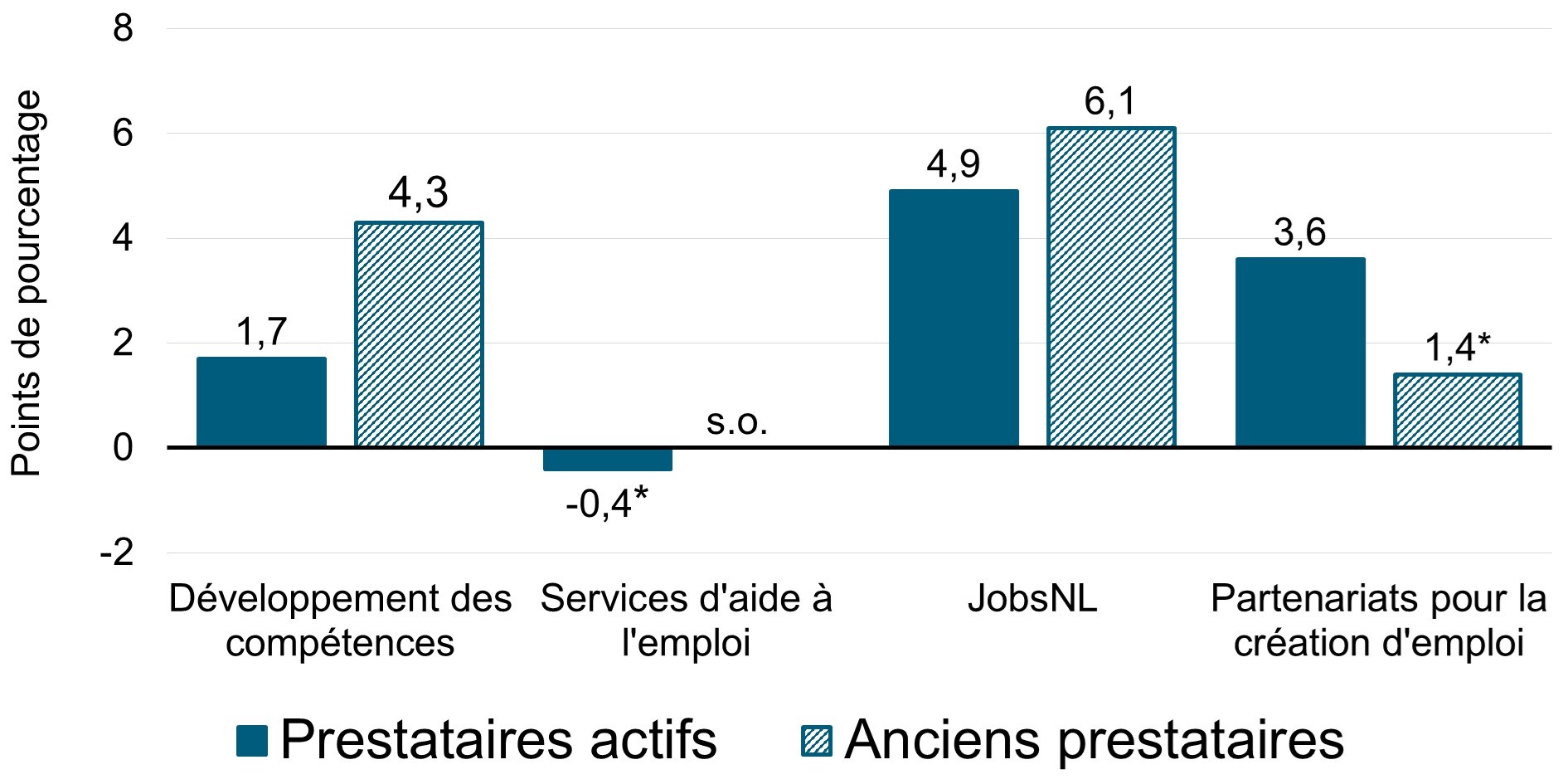 Dans l’ensemble, les impacts différentiels démontrent que les prestataires actifs et anciens de l’assurance-emploi participant au DC et les prestataires actifs de l’assurance-emploi participant à JobsNL renforcent leurs liens avec le marché du travail en augmentant leur incidence d’emploi et leur rémunération. Ils réduisent également leur dépendance à l’égard des mesures de soutien du revenu du gouvernement (c’est-à-dire l’assurance-emploi et l’aide sociale) par rapport à des non-participants semblables. Les prestataires actifs de l’assurance-emploi participant aux SAE augmentent également leurs revenus d’emploi et réduisent leur dépendance à l’égard des mesures de soutien du revenu du gouvernement.
