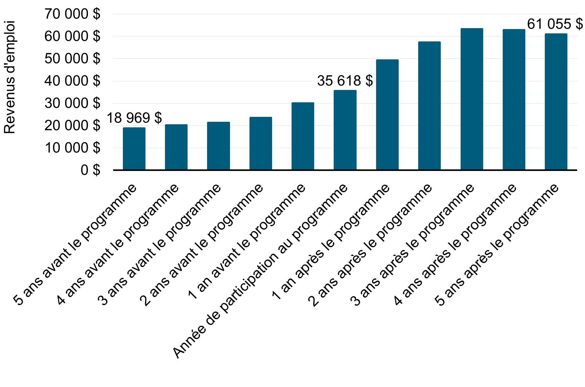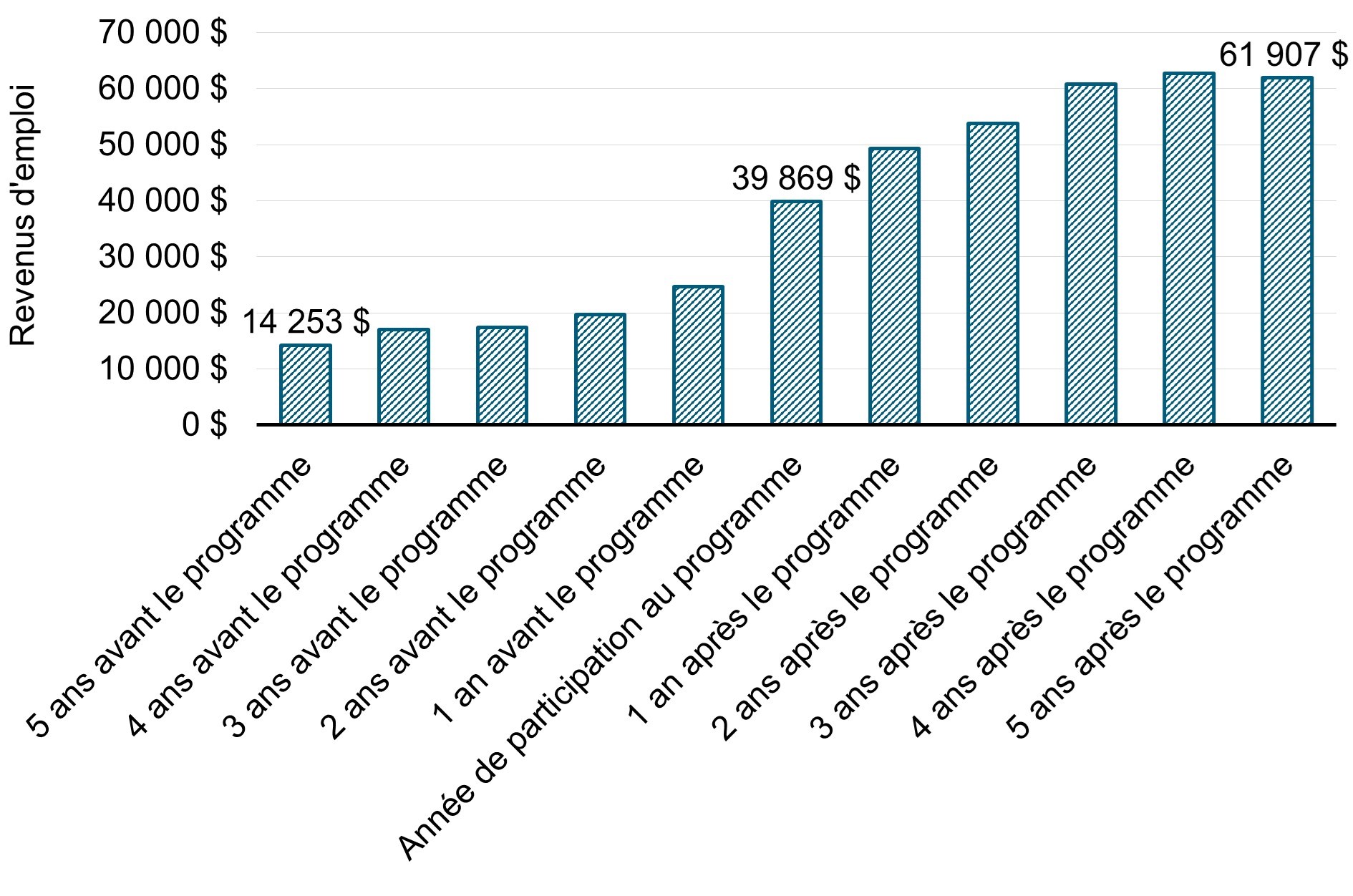 Comme le montre la figure 8, les participants au programme ont vu leurs revenus moyens augmenter de 14 253 $ au cours de la cinquième année précédant le programme à 61 907 $ au cours de la cinquième année qui a suivi l’année du début de la participation au programme.