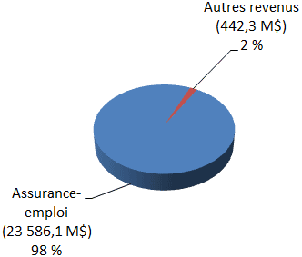 Le total des revenus pour l’exercice 2015-2016 s’élève à 24 028,4 millions de dollars, soit une augmentation de 566,6 millions de dollars par rapport au total des revenus de l’exercice précédent, qui s’élevait à 23 461,8 millions de dollars. La majeure partie de cette hausse s’explique par une augmentation des cotisations d’assurance-emploi associée à l’emploi qui a augmenté, en moyenne, de 0,7 % par rapport à 2014-2015, ainsi que par une augmentation du maximum de la rémunération assurable.